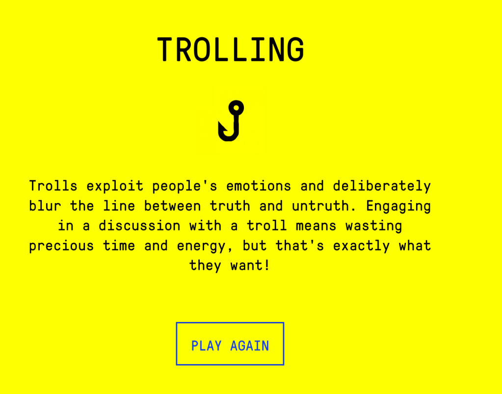 All in all, misinformation games like these, act as a stark reminder that people are purposefully acting to gain credibility by using several tactics aimed at people’s fears and lack of knowledge. Educational games like this help us identify tactics people use in misinformation campaigns.