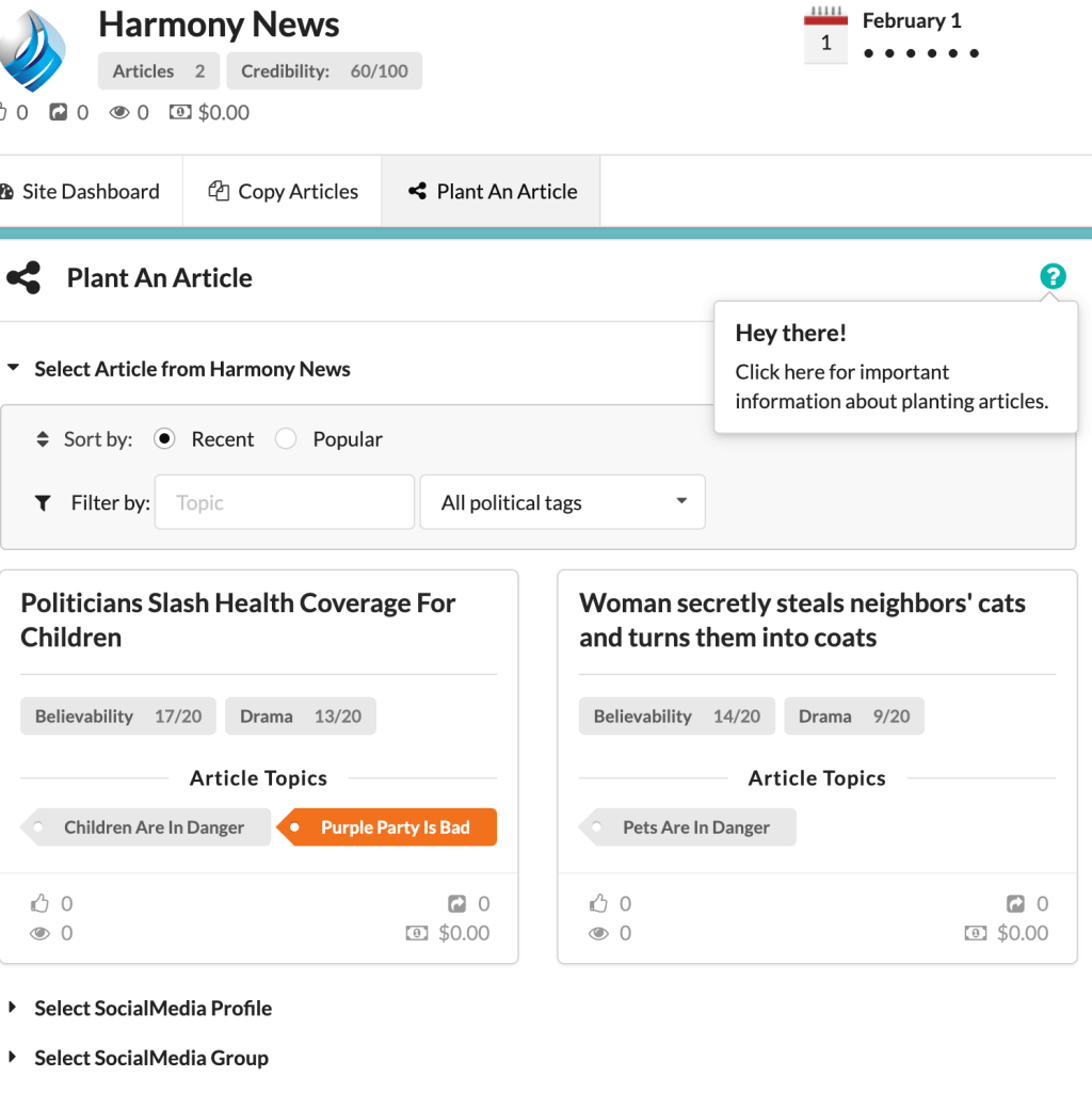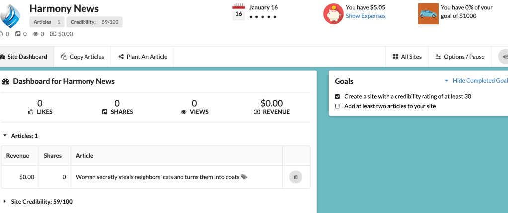 The game was easy to understand and gave me access to a range of tools to help me spread my “news.” I was able to create headlines from scratch and use a variety of platforms, including Twitter, Facebook, and Reddit, to spread my news. I also had access to a range of images, videos, and links to make my headlines more believable.