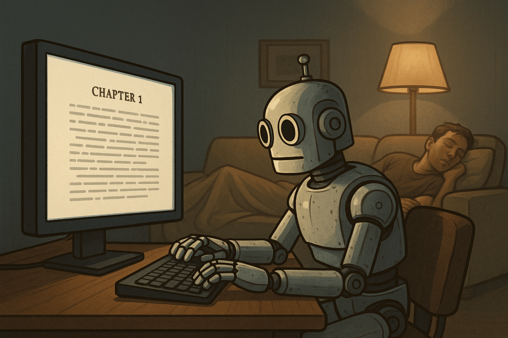 Imagine a robot sitting at a desk, typing away on a novel while the author naps nearby. That image sums up how some people feel about AI—doing all the creative work while we sit back. What makes it worse is that it even allowed me to utilize AI to create the image itself.